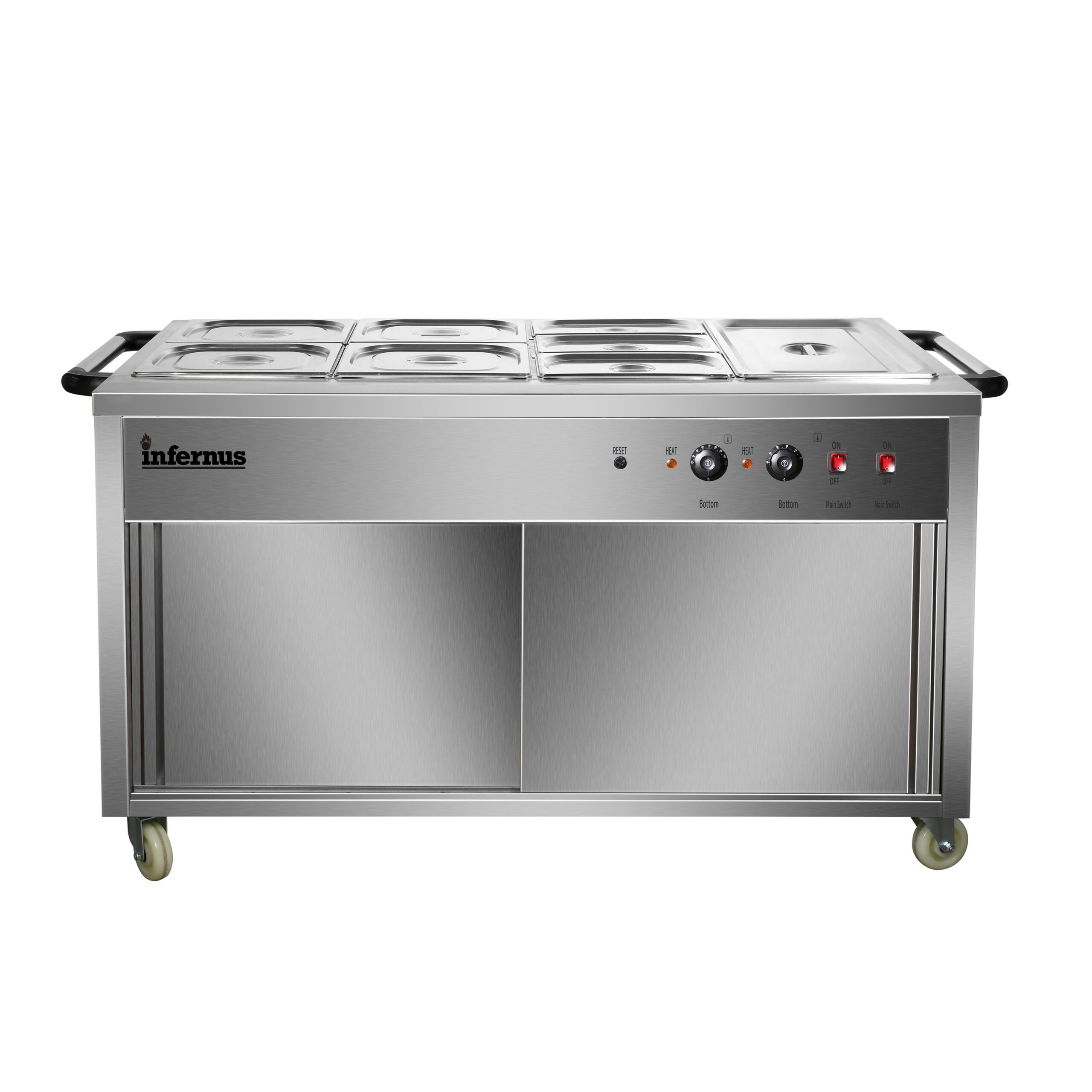 Built for the Demands of Commercial Service Constructed from heavy-duty stainless steel, the INF-HC155 is built to withstand the rigorous daily demands of a professional kitchen. The design prioritizes hygiene and ease of maintenance, with smooth surfaces and accessible sliding doors for efficient loading and serving. This high-capacity model is configured to hold up to seven Gastronorm pans, offering unparalleled versatility for diverse menus.