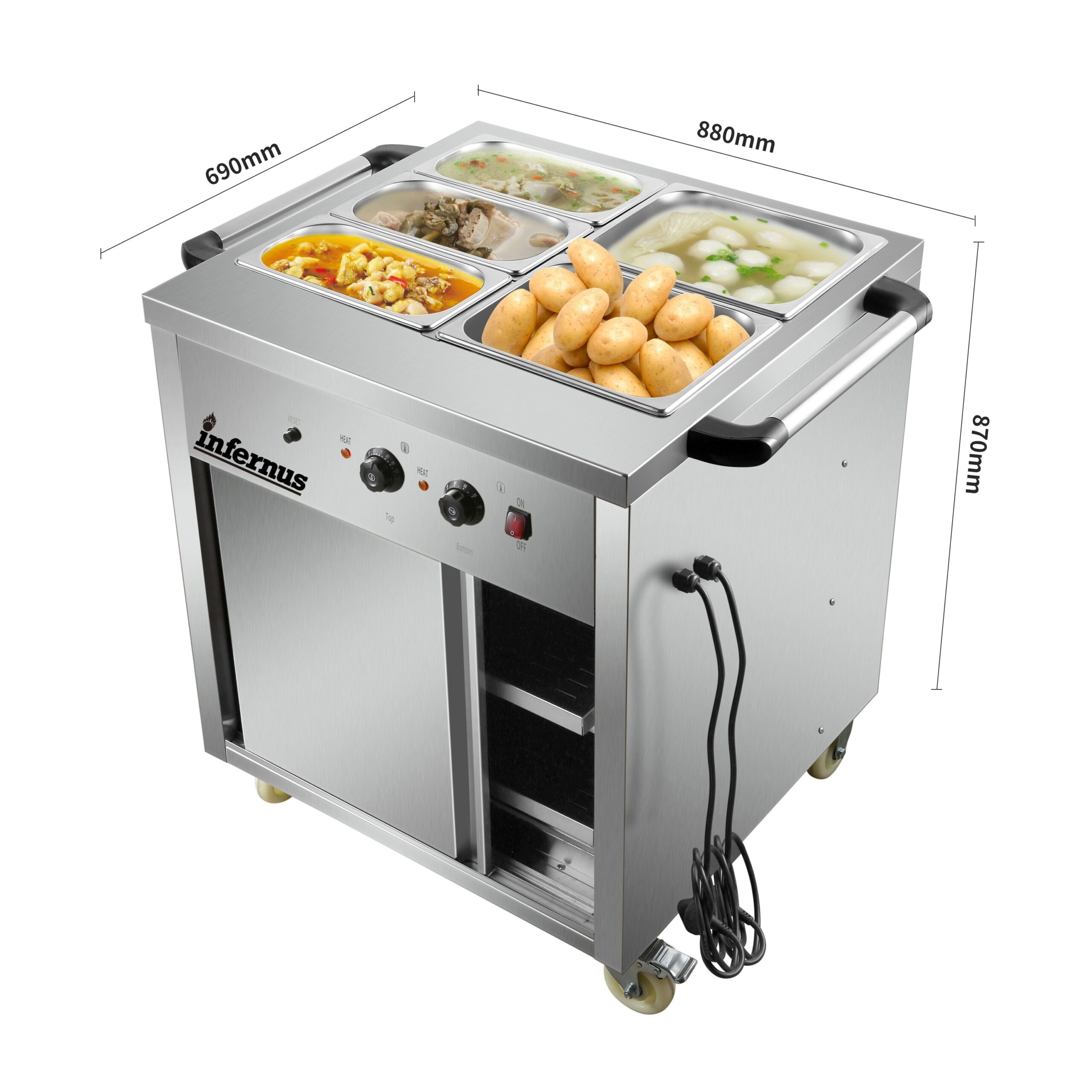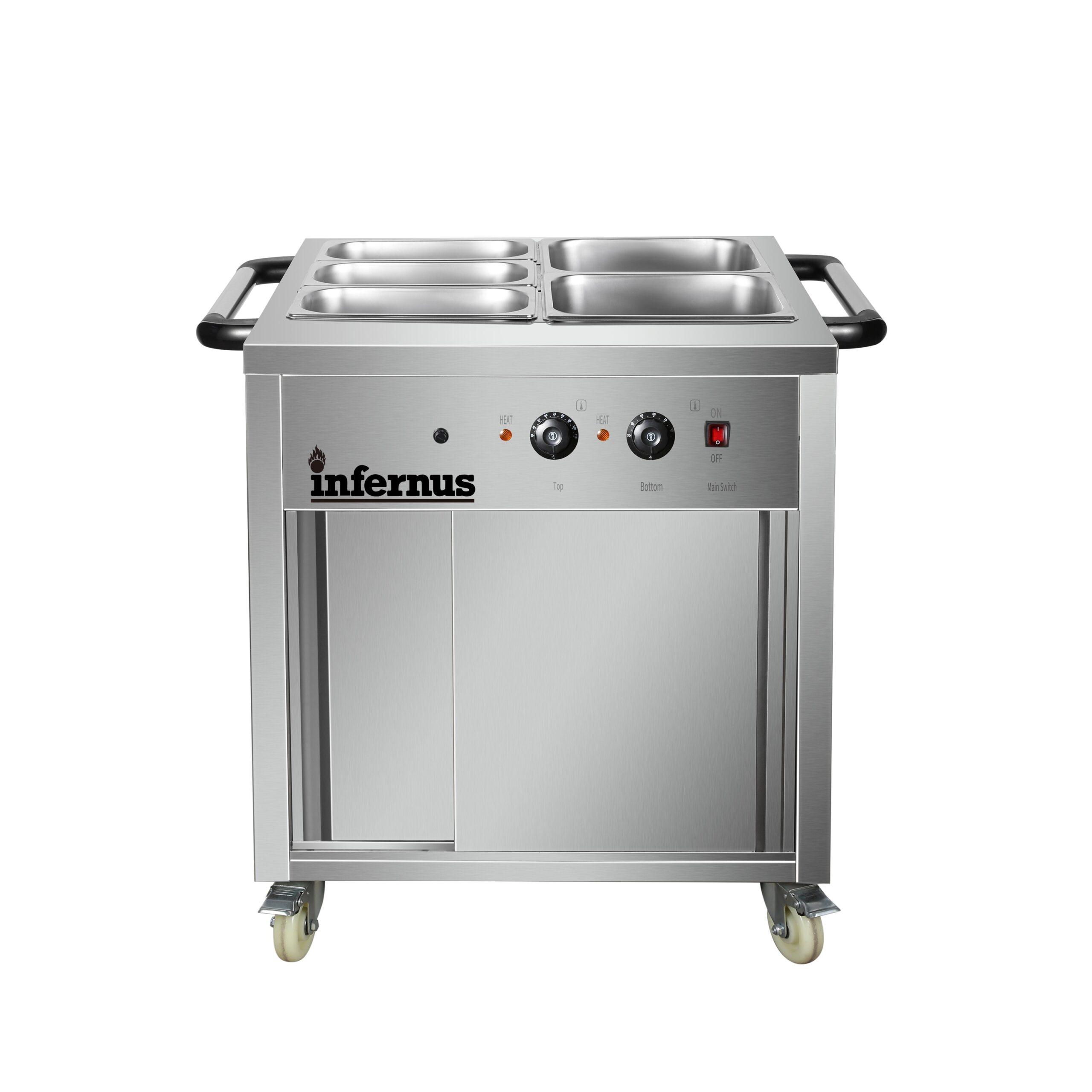 Durable Commercial Construction Manufactured from high-grade stainless steel, the INF-HC88 is built to withstand the rigors of heavy daily use in a commercial kitchen. The unit is designed with hygiene in mind, featuring easy-to-clean surfaces and accessible components. It comes configured to hold three Gastronorm pans, providing a flexible platform for various soups, main courses, and side dishes. With a simple 230V connection, it is ready to integrate seamlessly into your existing service line.