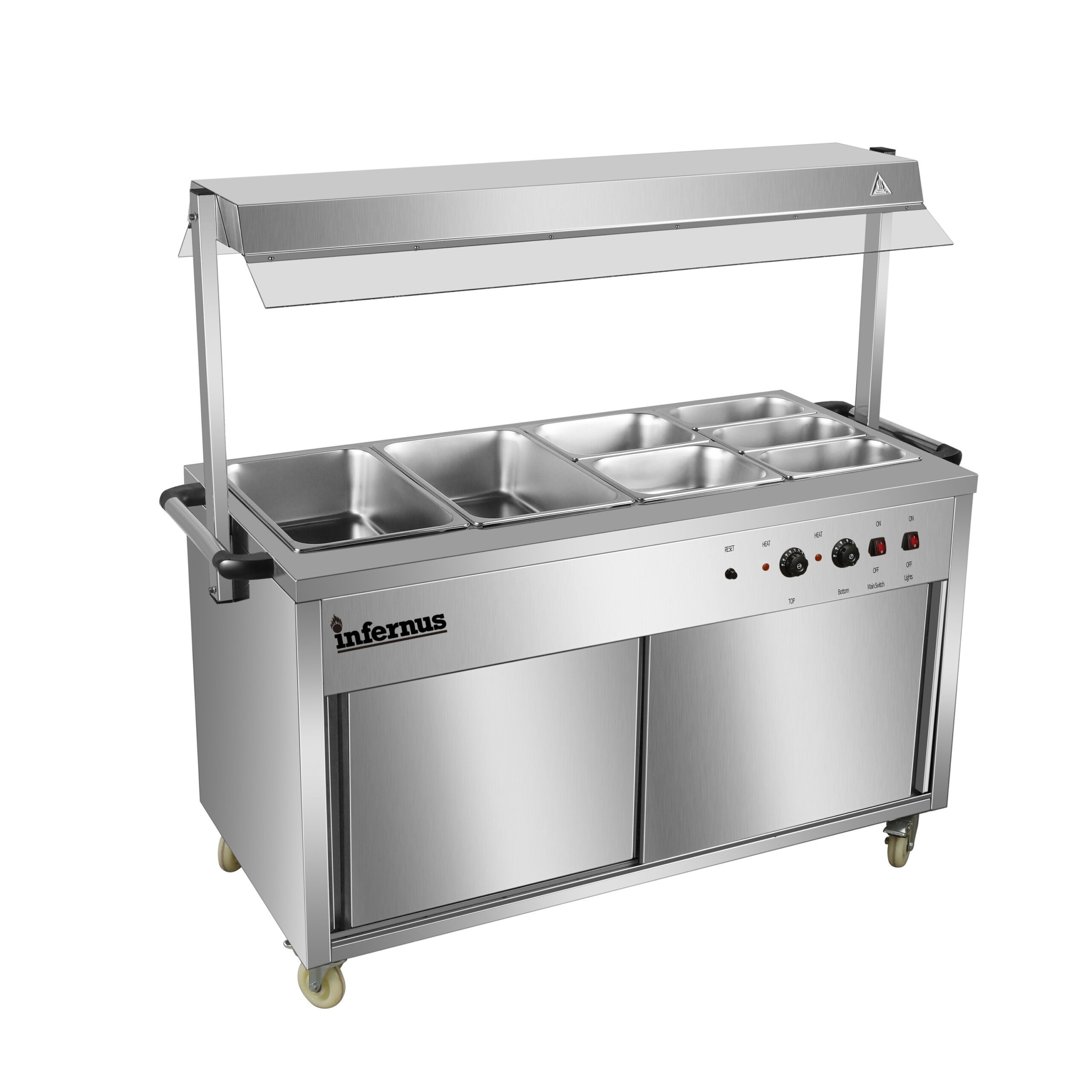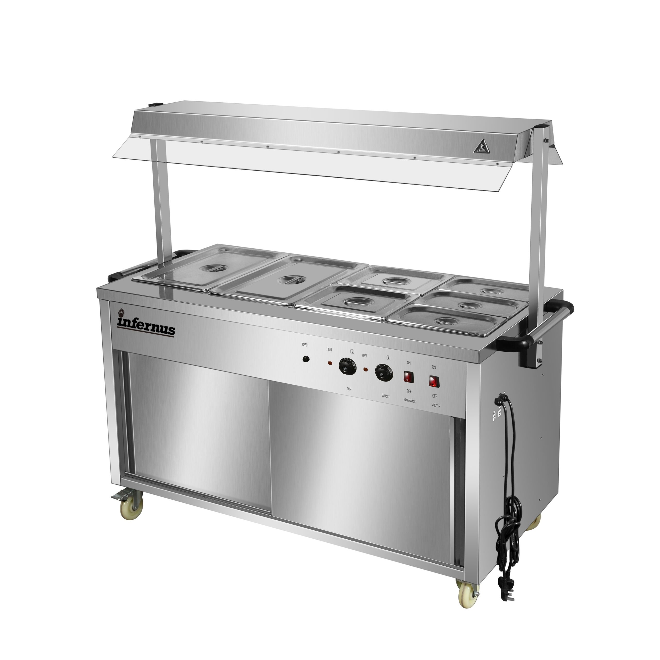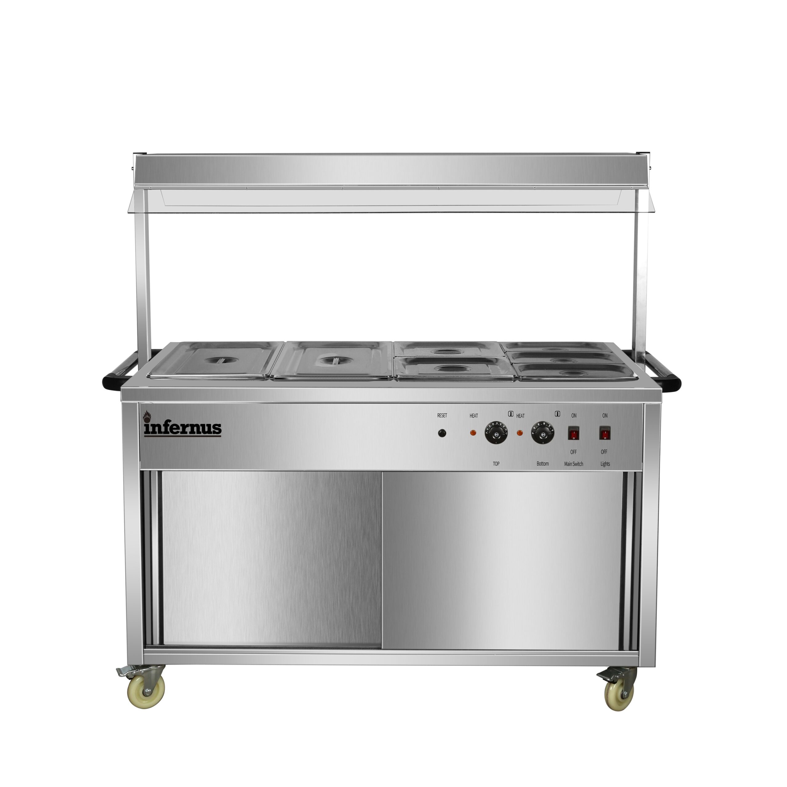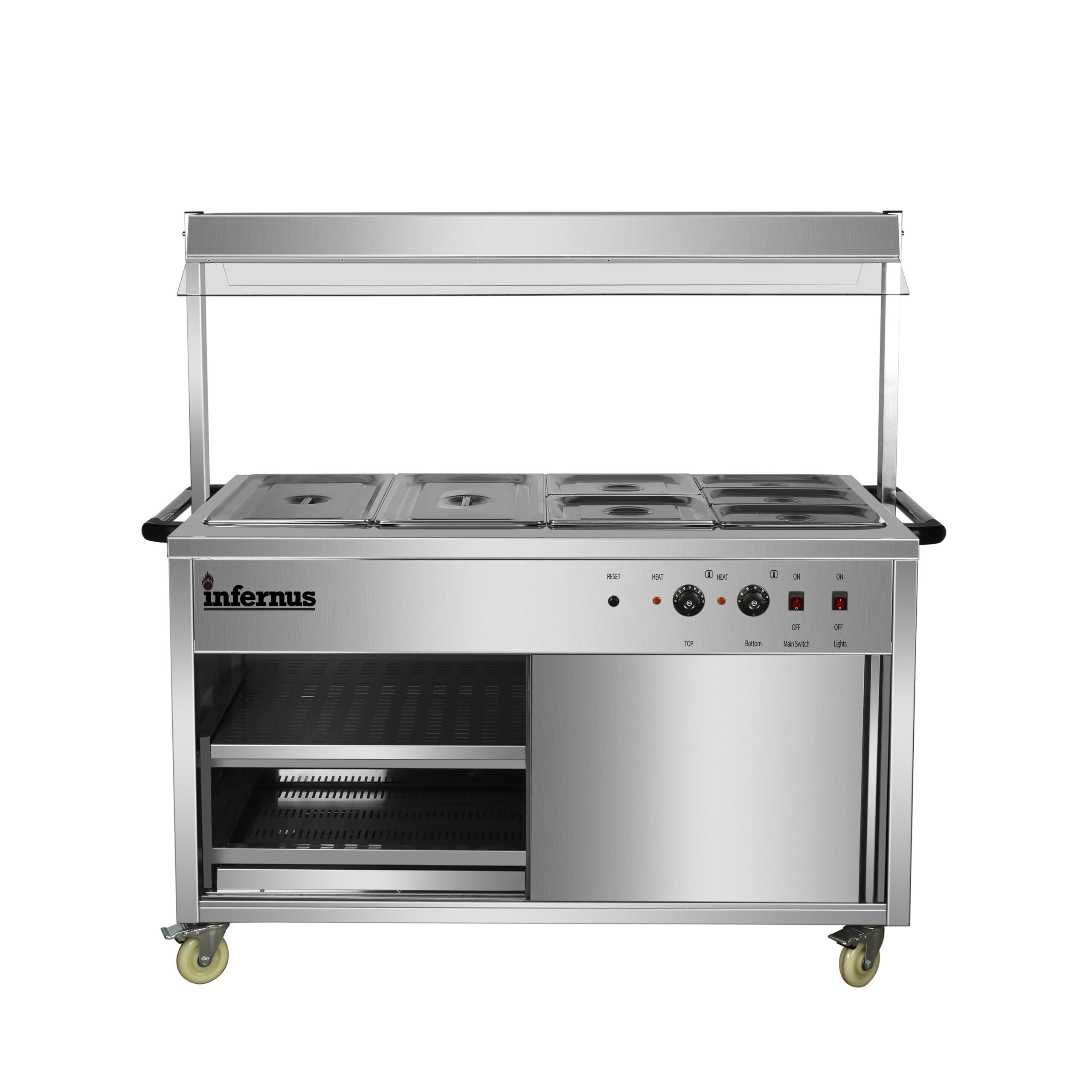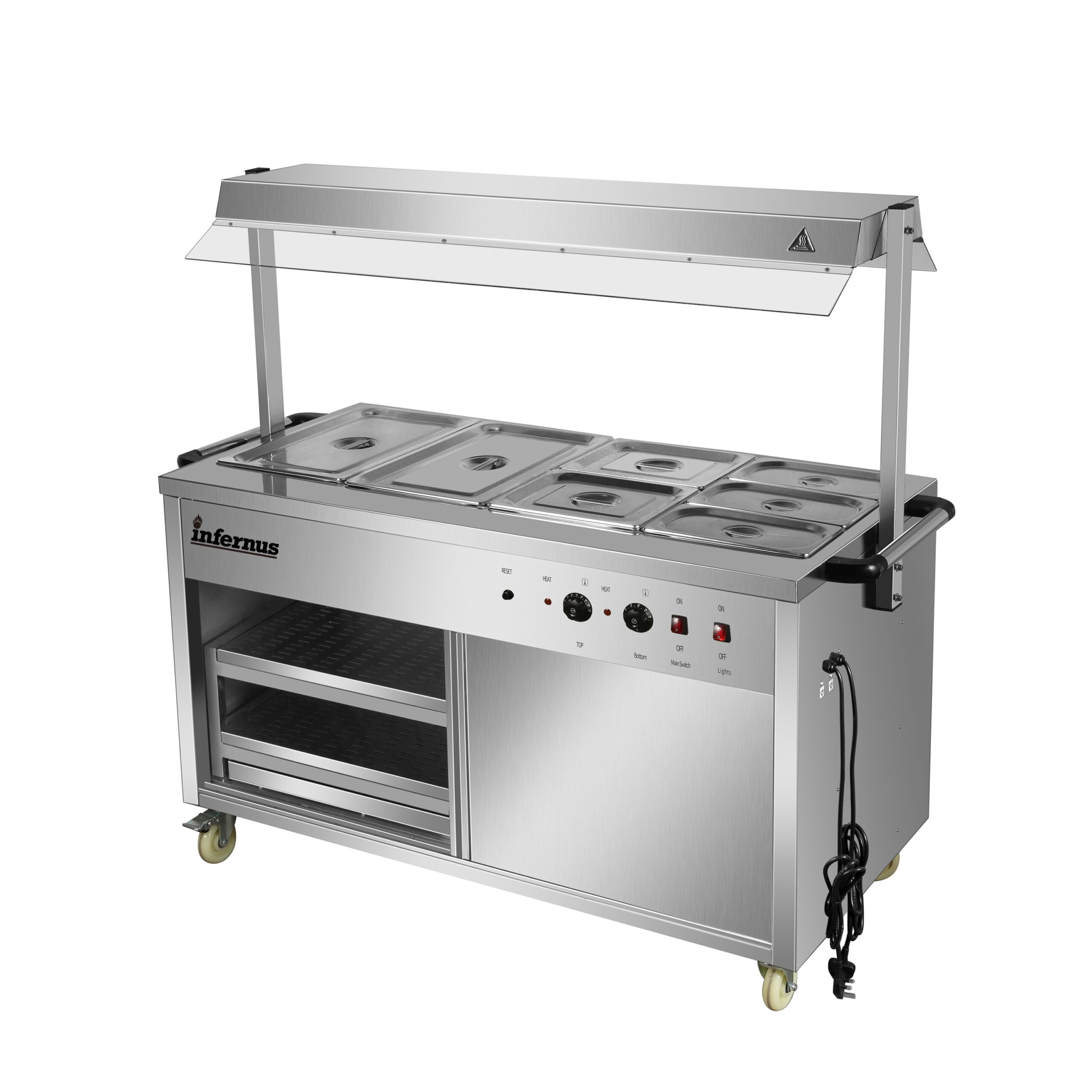 Versatile Storage & Durable Build The base features a high-performance heated cupboard, providing essential space for warming plates or holding backup food supplies. Constructed from heavy-duty stainless steel, the unit is as durable as it is stylish, engineered to handle the rigorous daily use of a busy commercial kitchen while remaining easy to clean and sanitize.