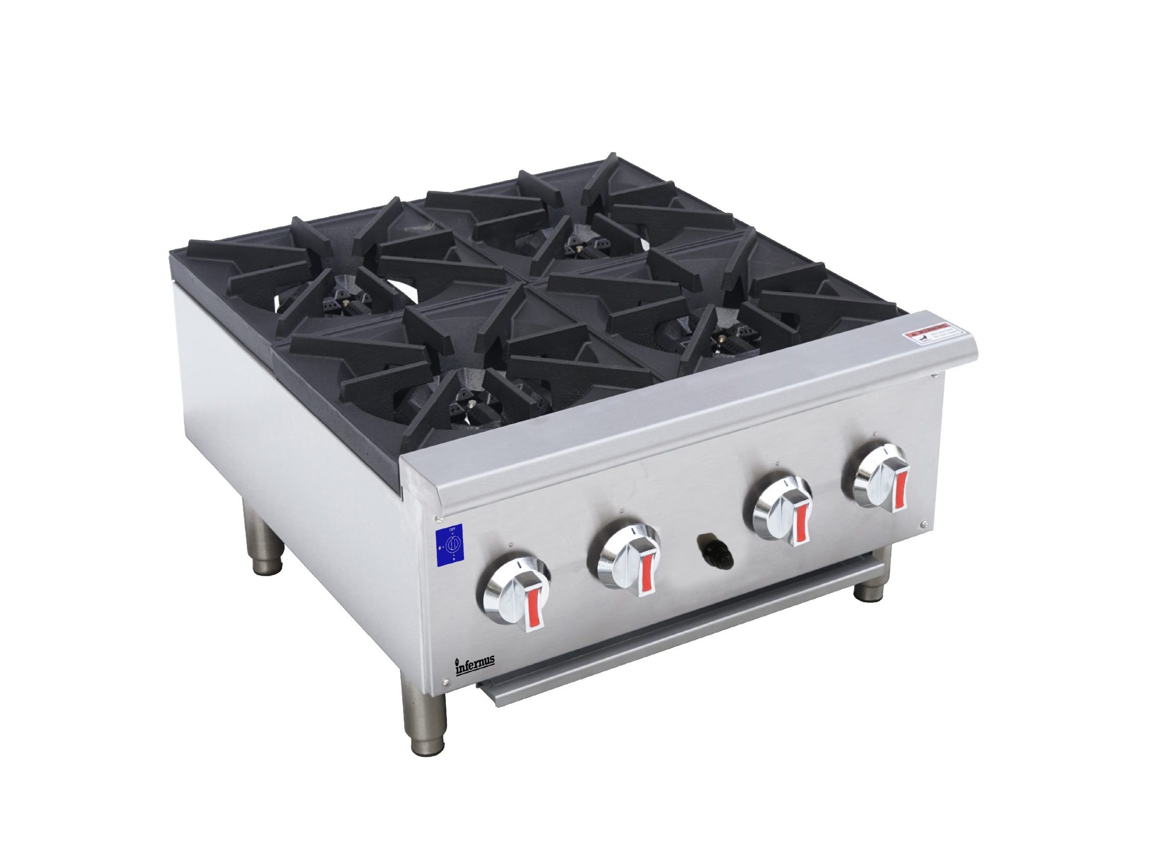 Powerful and Efficient Cooking for Professional Environments The Infernus 4 Burner Hob Gas Hotplate Cooker (INF-GB4) is a heavy-duty countertop solution designed for cafes, restaurants, and mobile catering units that require a high-output cooking surface in a compact footprint. With a 60cm (24-inch) width, this professional hotplate allows chefs to manage multiple dishes simultaneously with consistent heat and absolute control.