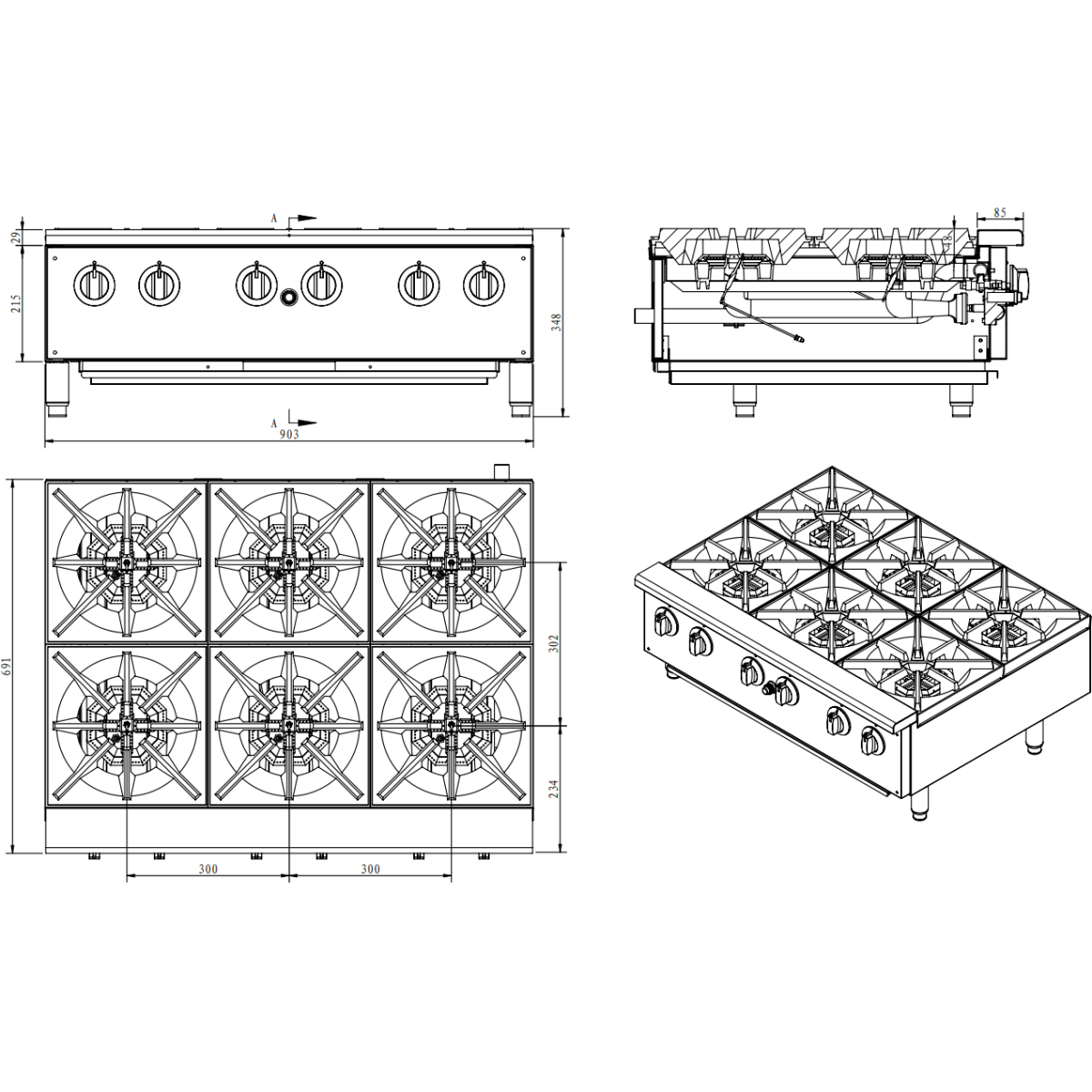 Rugged Durability and Easy Maintenance Built for the rigors of a commercial environment, this gas hob features six octagon-shaped cast iron burners and heavy-duty cast iron grates. The grates are easily removable, making daily cleaning and sanitation an effortless task. The unit is constructed with a robust stainless steel body and features zinc alloy knobs with a professional chrome coating, ensuring it can withstand the heat and intensity of a busy professional kitchen.