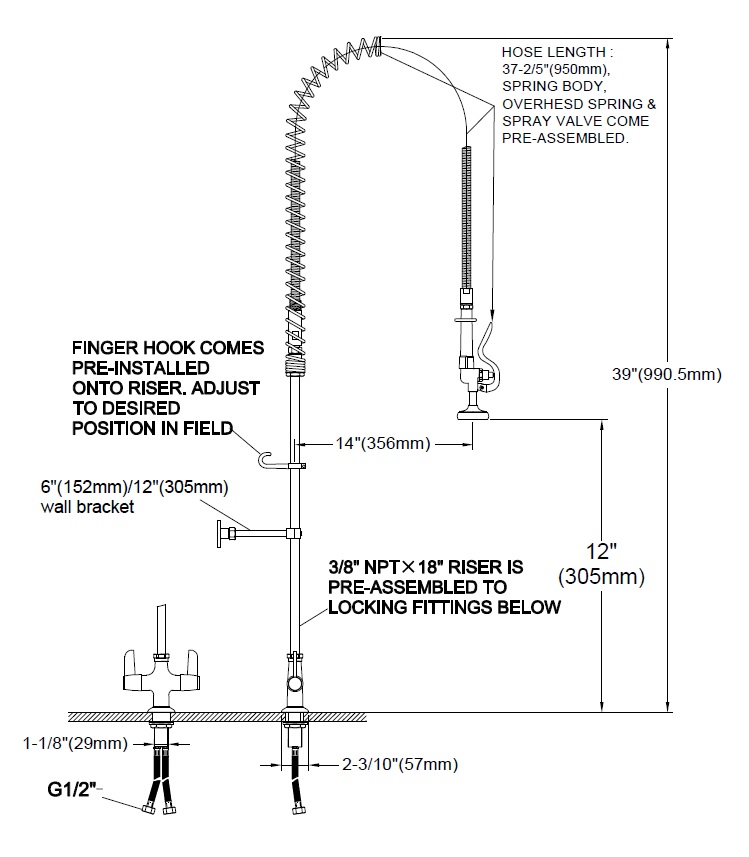 - Components: Spray gun, flexible hose, riser pipe, wall bracket, and swivel spout