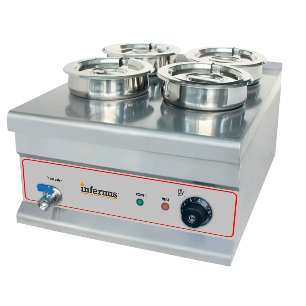 Efficient Warming for Medium-Volume Service The Infernus INF-4TT Electric Round Pot Bain Marie is a professional-grade food warmer tailored for mid-sized catering operations, restaurants, and buffets. Featuring four high-capacity 7-litre round pots, this unit allows you to keep up to 28 litres of soups, sauces, gravies, or pre-cooked dishes at the ideal serving temperature throughout your service period.