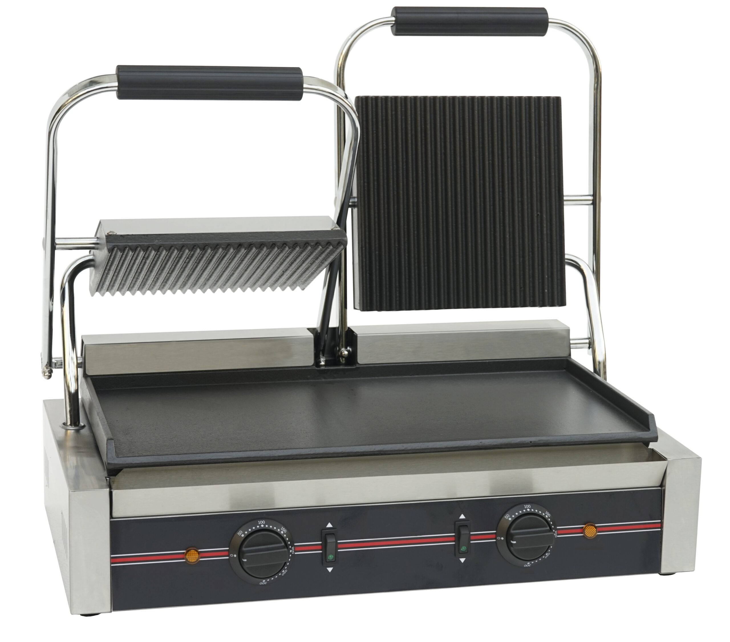 The Infernus Half-Ribbed Twin Panini Grill is a heavy-duty powerhouse designed for busy commercial kitchens that need to balance high output with professional presentation. Featuring two independent cooking zones, this twin unit allows you to handle double the orders, making it the perfect solution for busy cafés, delis, and takeaways during peak lunch rushes.